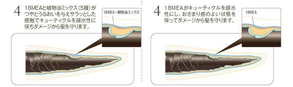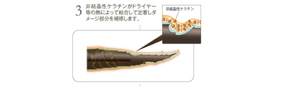 | 植物由来のオイル成分がドライヤー等の熱による髪の水分蒸散を抑制し、毛先にうるおいを与えます。 また、熱反応型のケラチンタンパク質が髪のダメージ部分に入り込み、ドライヤー等の熱により定着し、補修します |